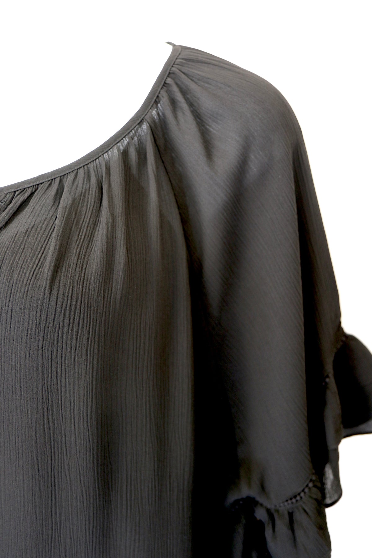 Black Tiered Ruffled Blouse with Tassels and Crochet details.