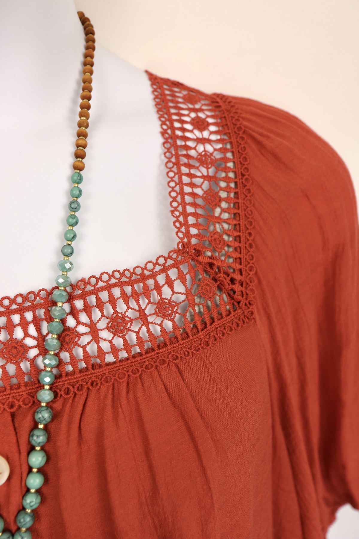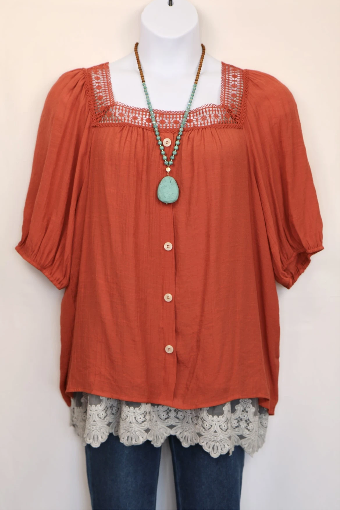 Bring effortless charm to your wardrobe with this flowy Peasant Blouse, designed with a romantic square lace necklineand delicate button-front detail. Made from a soft, lightweight blend of rayon and polyester, it drapes beautifully while keeping you cool and comfortable all day.